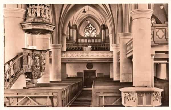 • Die Aufnahme der alten Orgel wurde von Brigitte Hollmann zur Verfügung gestellt. Es handelt sich um eine alte Ansichtskarte ohne Jahrgangsangabe mit dem Vermerk „Echte Photographie“. Sie ist im Anichtskartenverlag Zimmaß, Erfurt, erschienen. Der Verlag war dort bis in die 1930er Jahre ansäßig.